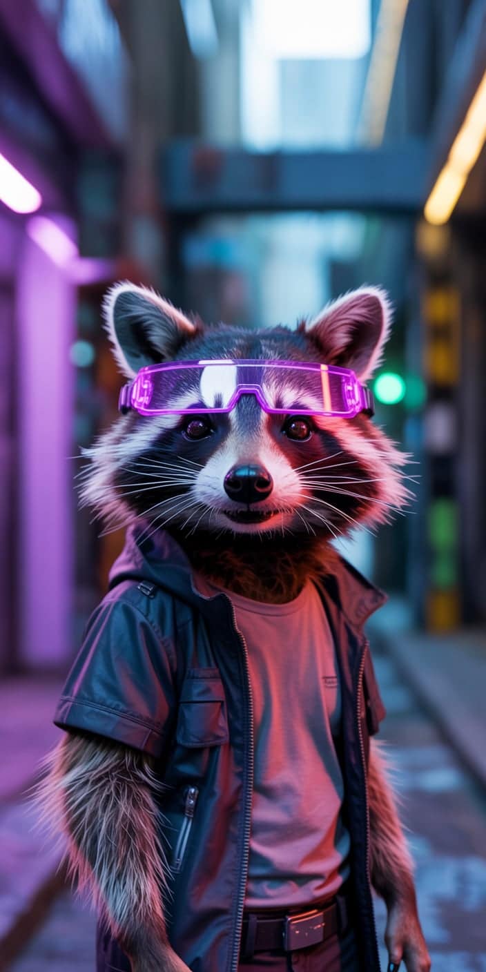 A stylish Cute Raccoon wears glowing purple visor glasses and a sleek jacket while standing in a neon-lit alleyway. The futuristic colors of pink and blue create an energetic cyberpunk atmosphere. Ideal for Racoon fans who enjoy bold, modern, and edgy designs for their smartphones.