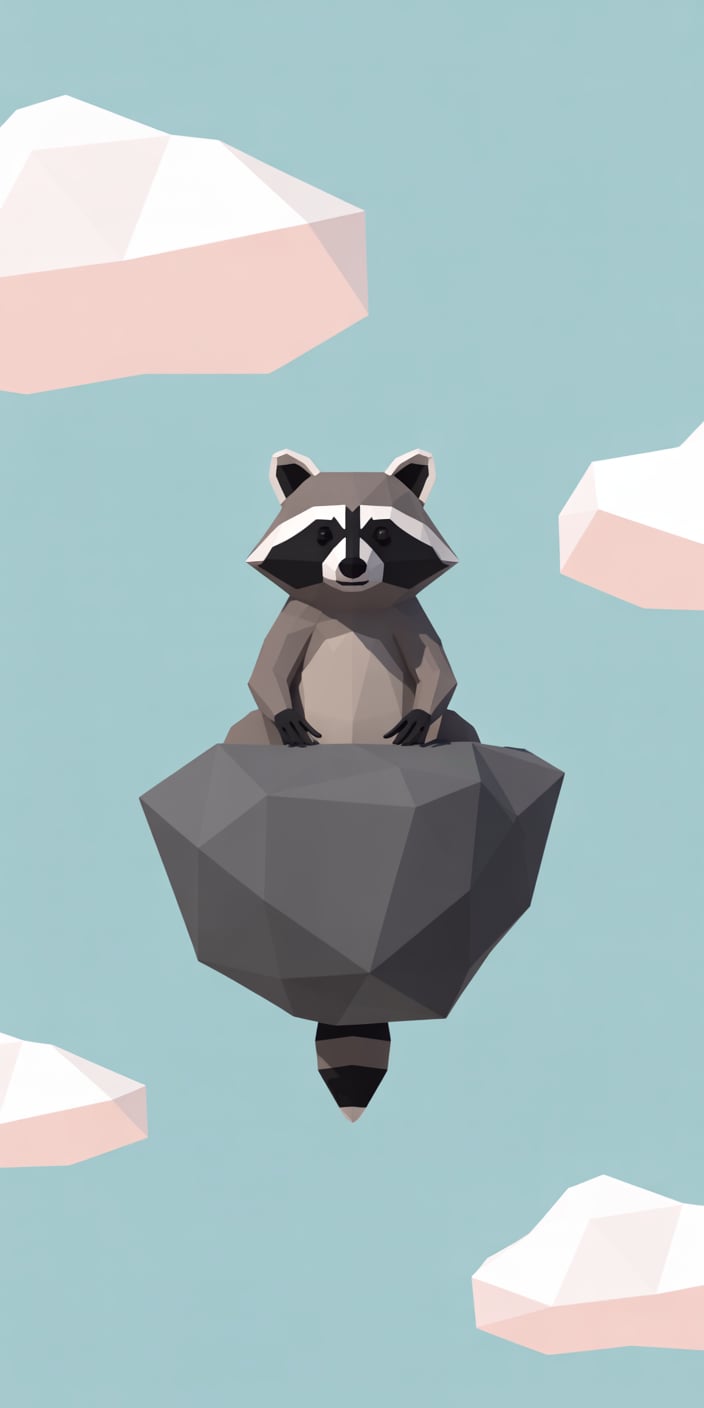 A charming low-poly style Cute Raccoon sits atop a floating geometric rock among fluffy clouds against a soft blue sky. The minimalist design blends modern art with playful wildlife charm, making it perfect for fans of Pet Raccoon imagery and abstract styles. This clean, airy wallpaper is ideal for giving your iPhone or Samsung a fresh and creative touch.