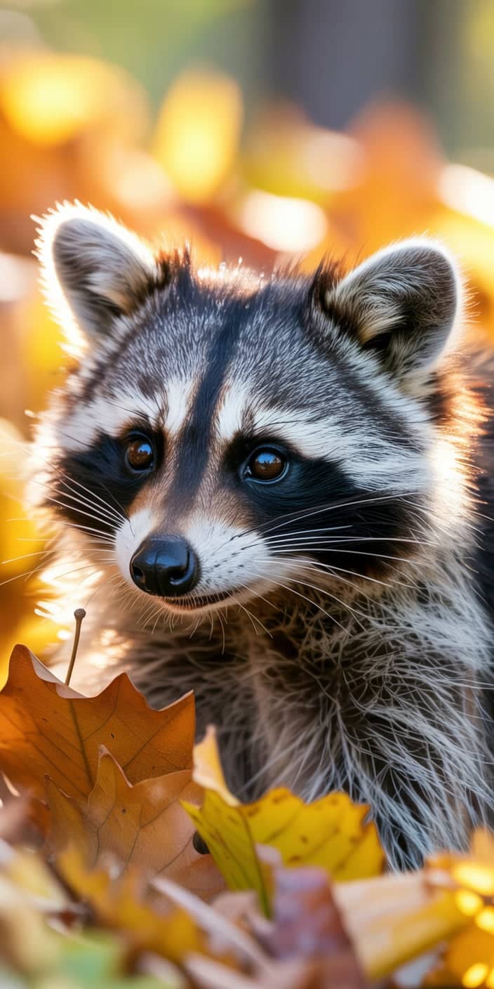 A Cute Raccoon peers out from a pile of golden autumn leaves, its fur glowing in the soft seasonal sunlight. This charming image is perfect for Pet Raccoon lovers and fans of cozy, nature-filled phone backgrounds.