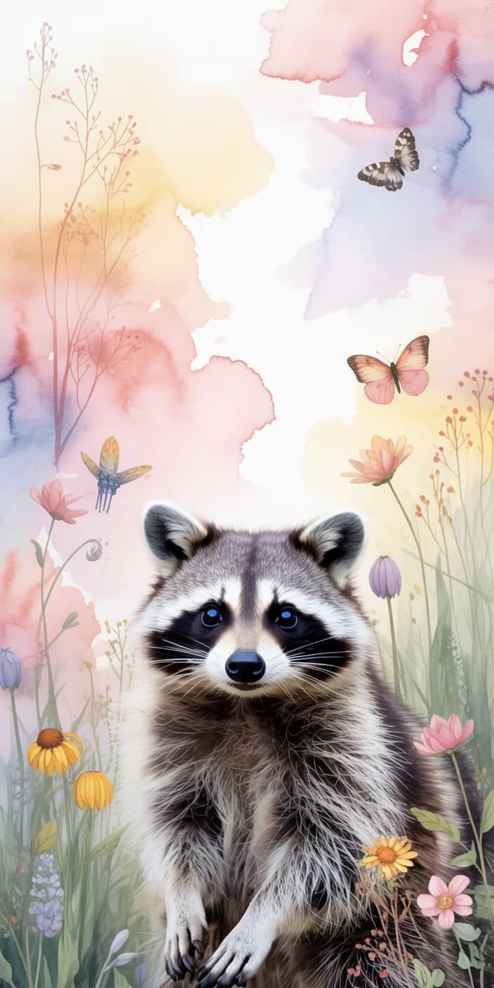 This serene wallpaper shows a Cute Raccoon in a dreamy meadow with butterflies and watercolor skies. Ideal for Pet Raccoon fans who want a soft and peaceful phone background. Let your screen feel like a spring morning.