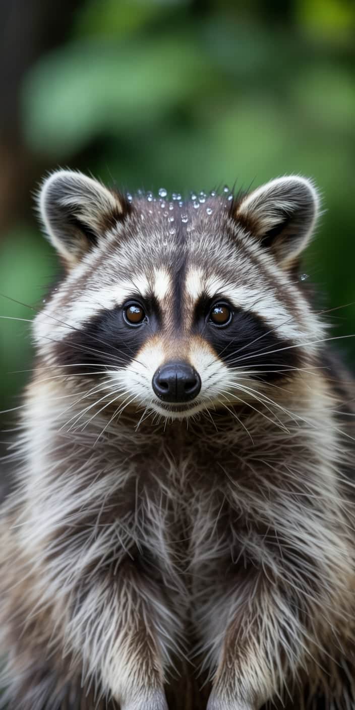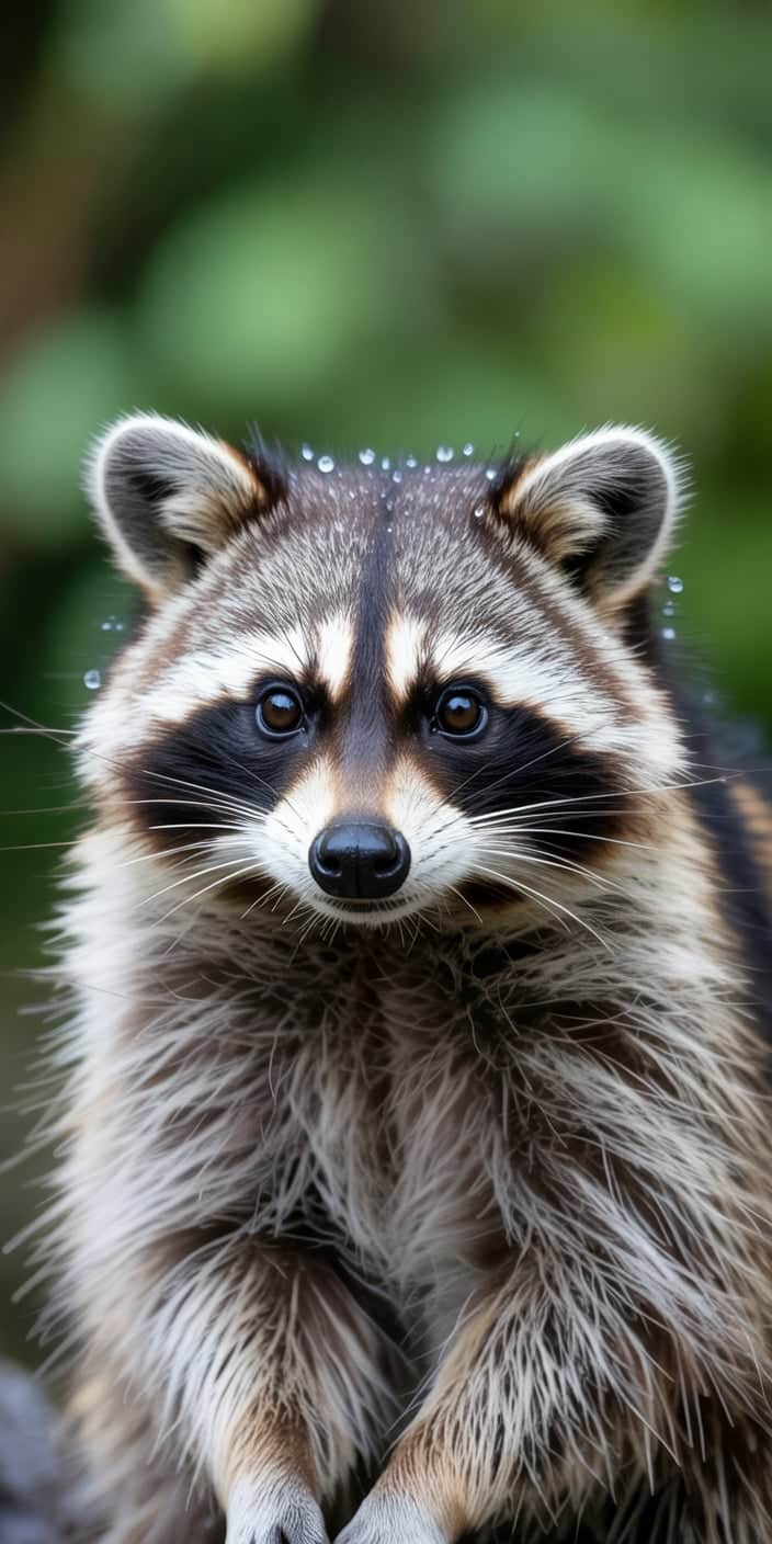 A stunning close-up of a Cute Raccoon with sparkling raindrops on its fur, set against a lush green background. The detail in the fur and the raccoon’s bright eyes make it perfect for Pet Raccoon lovers and nature photography fans. A beautiful choice for anyone who wants wildlife elegance on their phone.