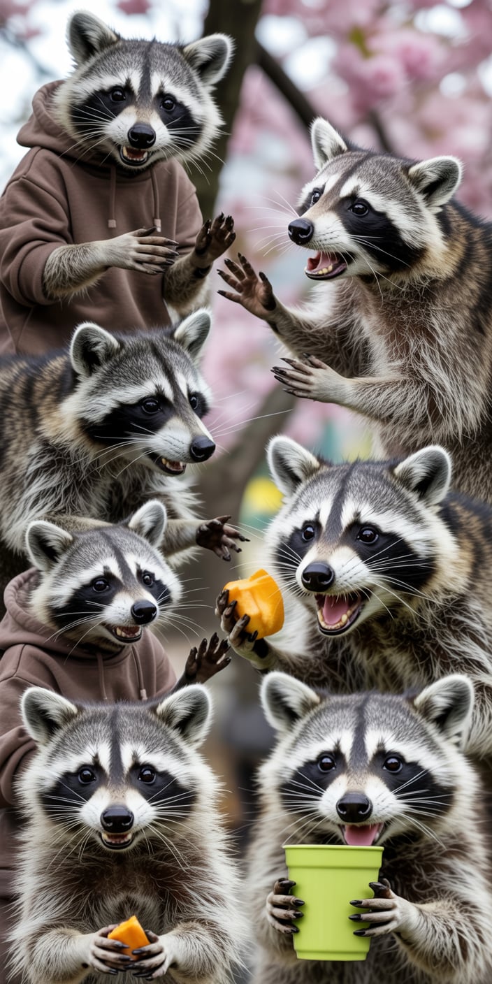 A delightful collage of Cute Raccoon moments, from sipping from a green cup to enjoying snacks, all set against a background of pink blossoms. Perfect for Pet Raccoon lovers who enjoy lively, expressive animal portraits.