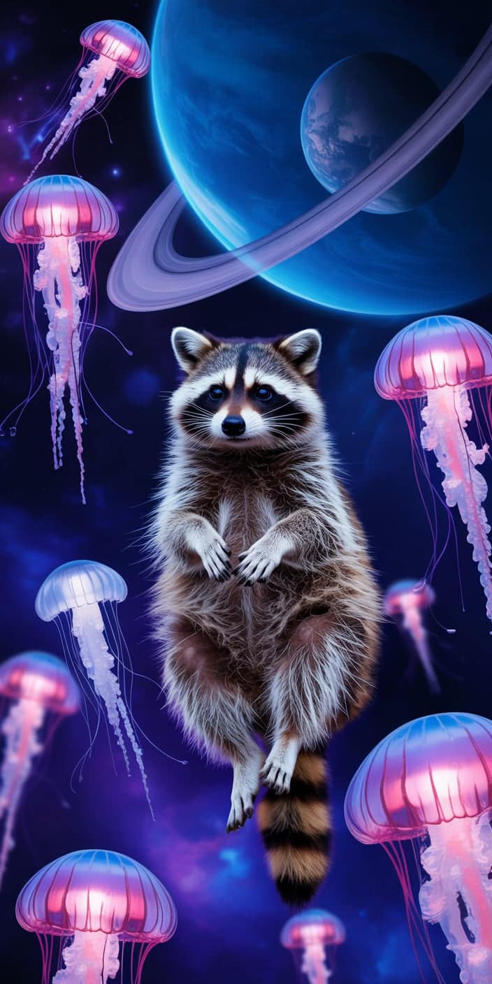 This dreamy space wallpaper features a sweet Cute Raccoon drifting among luminous pink jellyfish and a stunning view of Saturn’s rings. The mix of cosmic colors and adorable wildlife makes it perfect for animal lovers with a love of fantasy. It’s a magical pick for your smartphone if you adore Pet Raccoon art and want something totally unique. Let this charming raccoon brighten your screen with cosmic cuteness.