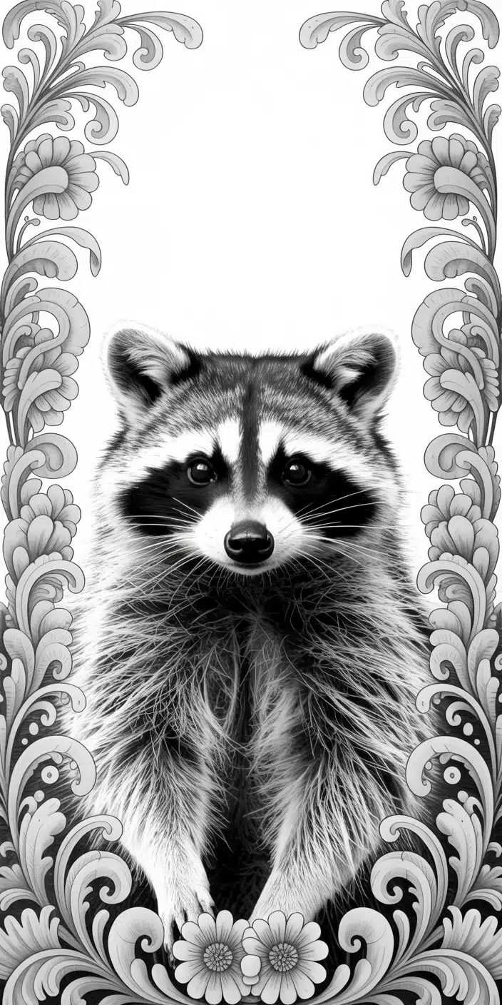 A detailed black-and-white illustration of a Cute Raccoon framed by elegant floral designs. The intricate linework highlights the raccoon’s expressive eyes and soft fur while the symmetrical flowers add a touch of classic elegance. Ideal for smartphone users who love Racoon art with a sophisticated twist, this piece combines wildlife charm with artistic beauty. A perfect choice for nature and monochrome art lovers alike.