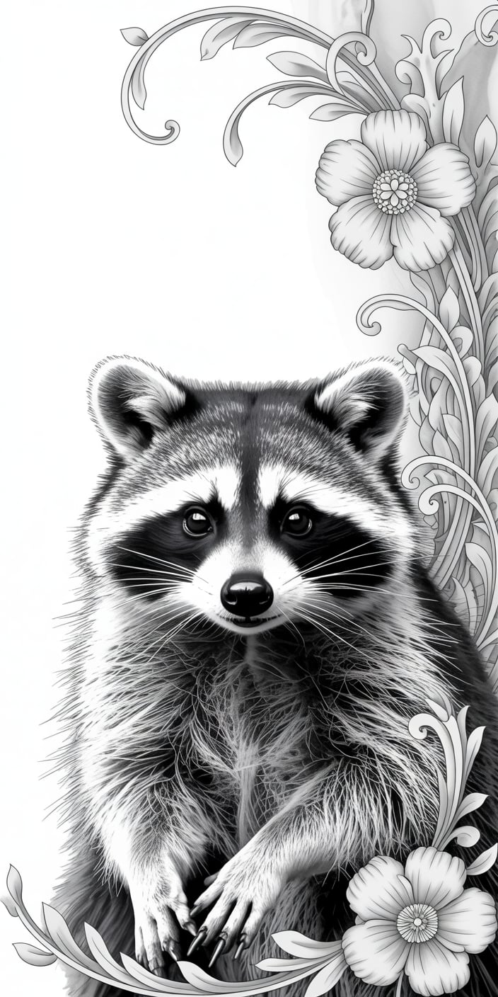 A monochrome Cute Raccoon gazes sweetly from within a side-framed floral border, its fur and eyes beautifully rendered in fine detail. The black-and-white palette gives it an artistic elegance, while the flowers add softness and balance. Perfect for anyone who loves Pet Raccoon artwork with a refined touch, this design makes a stylish and adorable smartphone background.