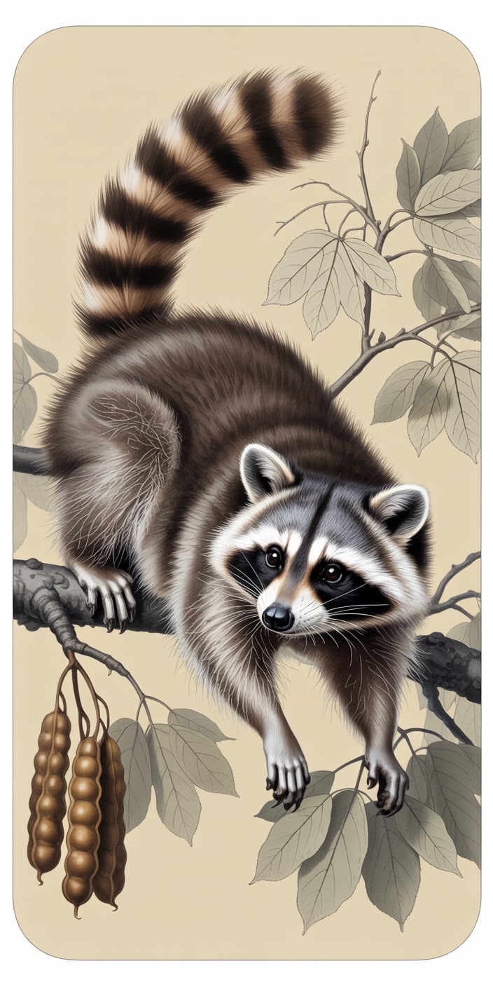 A detailed vintage-style illustration of a Cute Raccoon perched on a branch, surrounded by botanical elements in soft, muted tones. Perfect for Pet Raccoon fans who appreciate artistic, nature-inspired designs for their phone background.