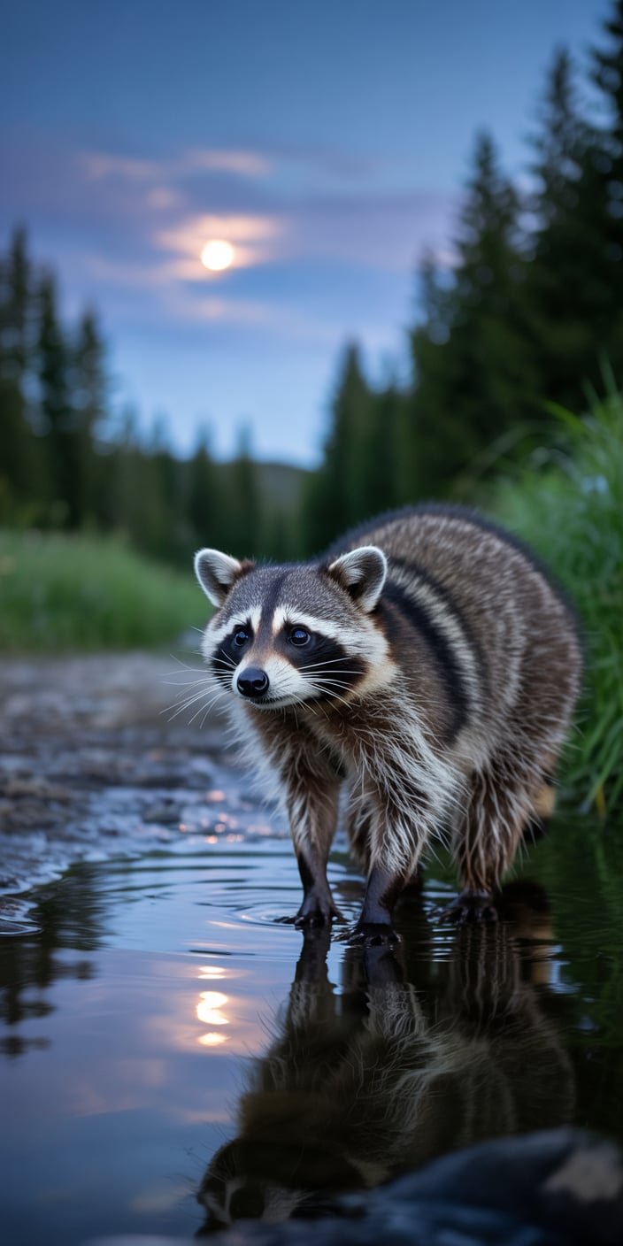 A peaceful Cute Raccoon stands in a shallow stream under the glow of the moon, with the reflection shimmering in the water. The forest background and twilight colors make this perfect for Pet Raccoon lovers who enjoy tranquil, nature-inspired scenes. A calming choice for your smartphone background.