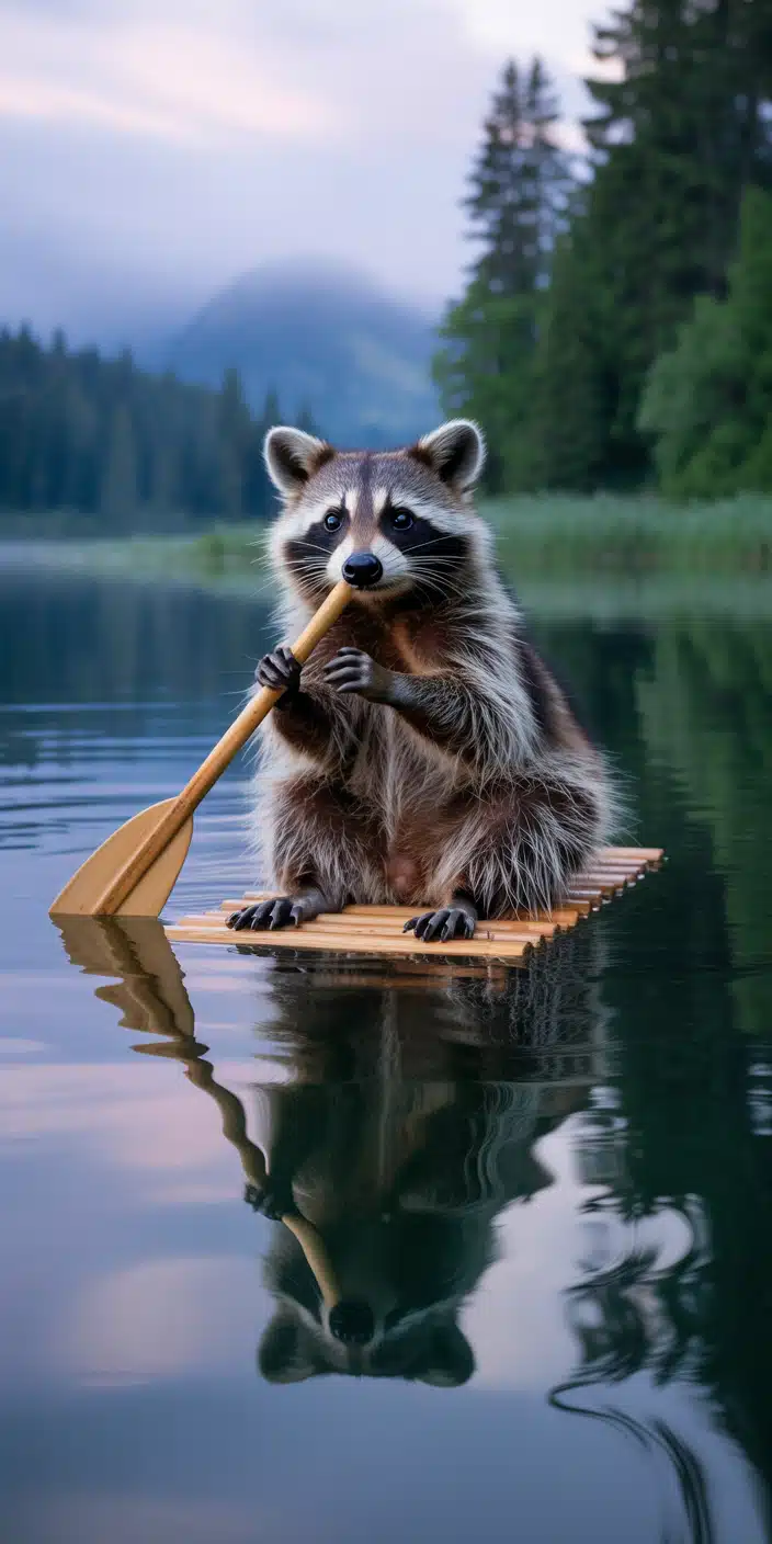 A serene Cute Raccoon paddles a small wooden raft across a calm mountain lake, surrounded by misty forests. The soft evening light reflects in the water, creating a peaceful atmosphere. Perfect for Pet Raccoon enthusiasts and nature lovers, this scene blends wildlife charm with tranquil beauty for a soothing phone background.