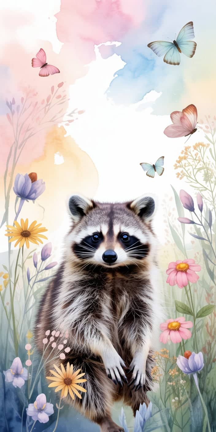 A gentle Cute Raccoon stands in a pastel meadow with butterflies drifting through the watercolor sky. The blend of soft pink, blue, and yellow shades creates a calming, fairytale vibe. Perfect for Pet Raccoon admirers and those who love nature-themed phone art.