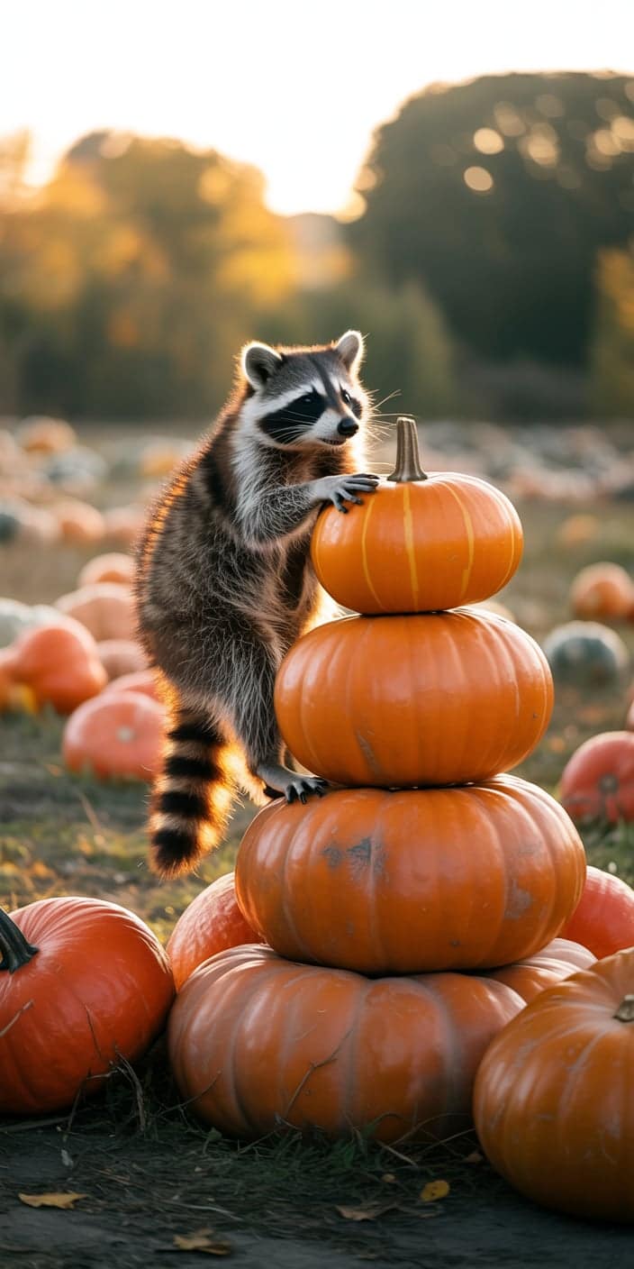 A playful Cute Raccoon balances atop a tall stack of bright orange pumpkins in a golden autumn field. The warm sunlight and fall colors make this image perfect for Pet Raccoon lovers and seasonal backgrounds. Ideal for iPhone or Samsung, it brings cozy harvest vibes to your screen while showcasing the raccoon’s curious charm.