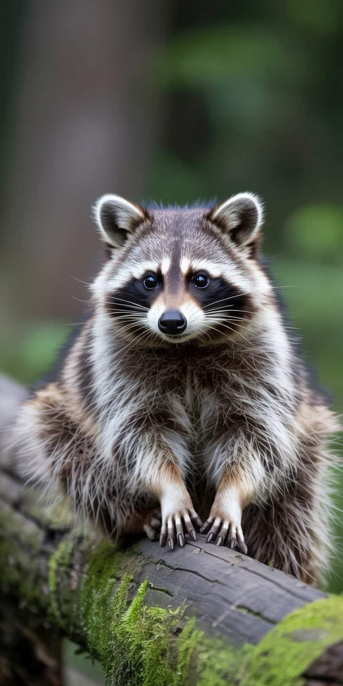 A sweet Cute Raccoon sits calmly on a mossy forest log, looking directly into the camera with bright, curious eyes. This detailed portrait is perfect for Pet Raccoon lovers and nature photography fans alike.