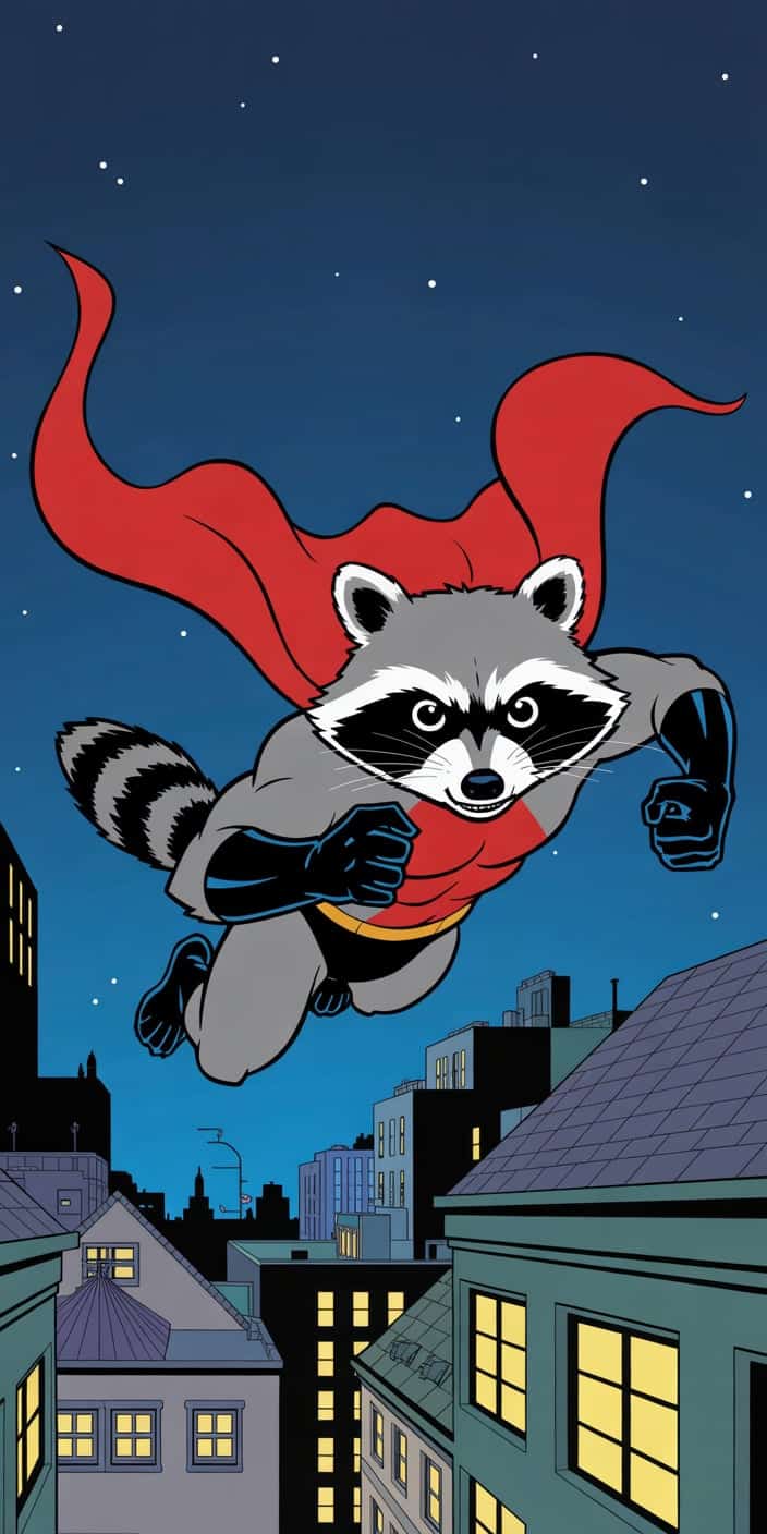 A bold Cute Raccoon takes to the skies in full superhero costume, complete with a red cape, soaring above a nighttime city skyline. The comic-style artwork adds fun and energy, perfect for Racoon fans who enjoy playful and adventurous designs. This wallpaper is ideal for brightening your phone with heroic charm.