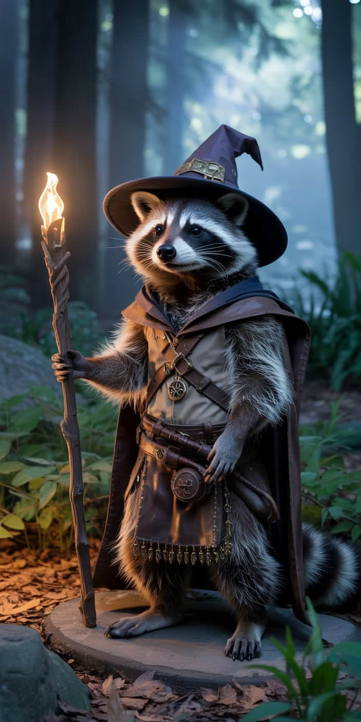 A magical Cute Raccoon dressed as a wizard stands in a misty forest, holding a glowing staff. The intricate costume details, including a pointed hat, leather belt, and pouches, give this woodland mage an enchanting personality. Perfect for Pet Raccoon fans and lovers of fantasy art, this creative design makes an unforgettable iPhone or Samsung wallpaper. Let this mystical raccoon bring a touch of magic to your screen.