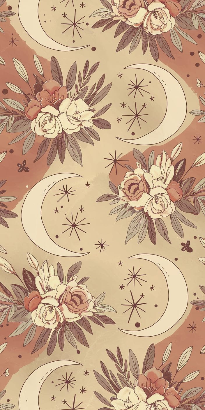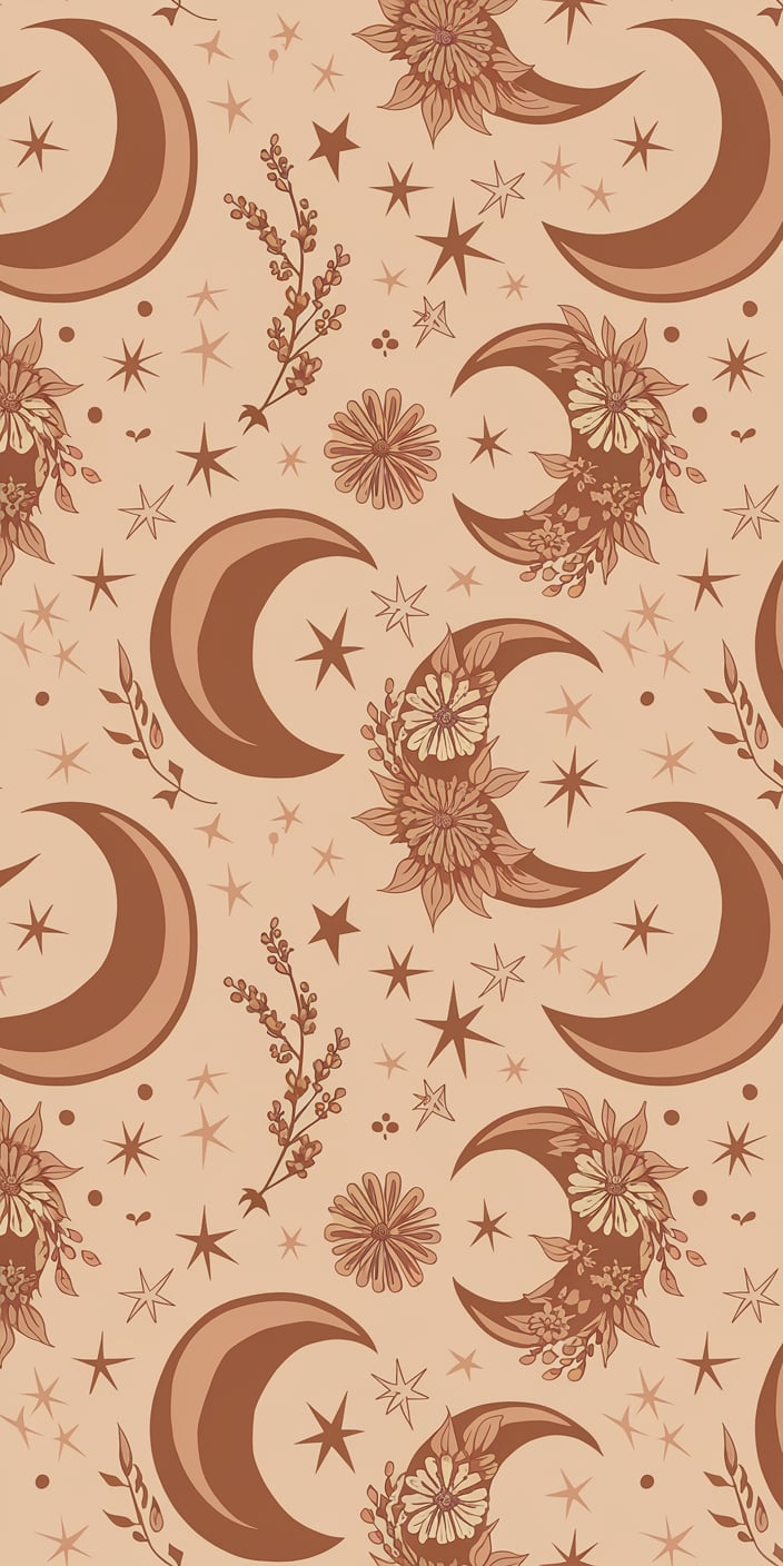 A boho-inspired wallpaper featuring crescent moons, delicate flowers, and soft star patterns in warm earthy tones. The combination of muted beige, brown, and soft reds creates a cozy and natural feel. This cute iPhone background is perfect for those who love bohemian and celestial styles. Add a touch of warmth and charm to your phone with this unique design.