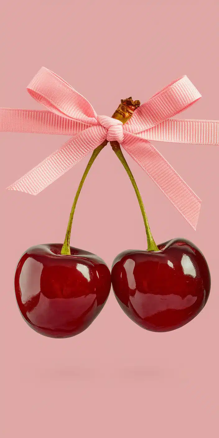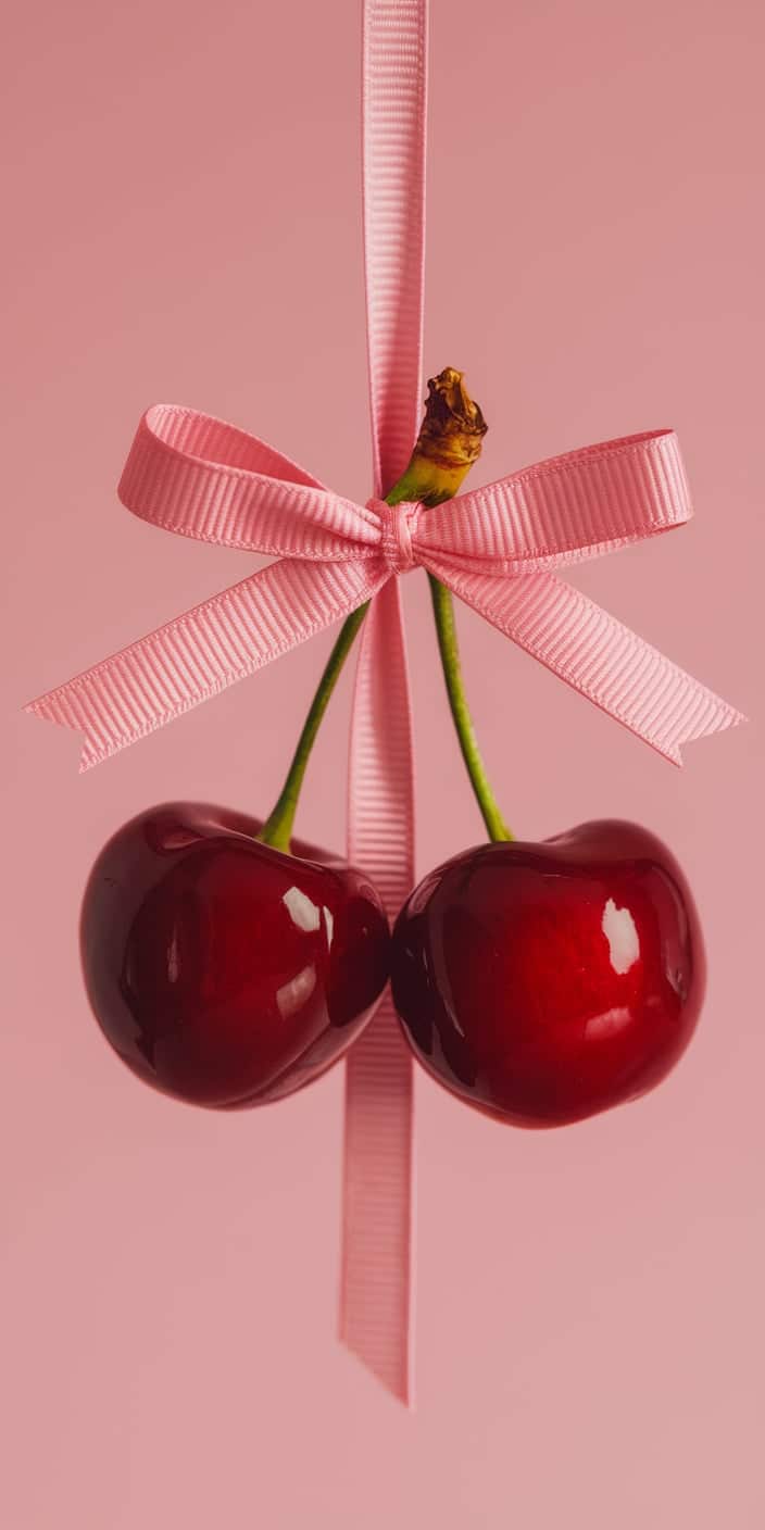 A charming design featuring two glossy red cherries tied with a pink bow, hanging elegantly against a soft pink background. The rich red and soft pastel pink create a playful and stylish contrast. This super cute wallpaper is ideal for iPhone and Samsung users who love fun and girly aesthetics. Add a touch of sweetness to your phone with this cute cherry-themed background.