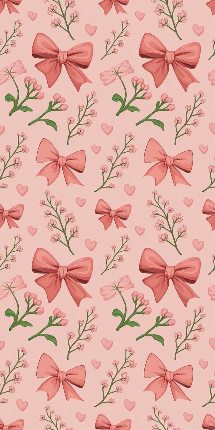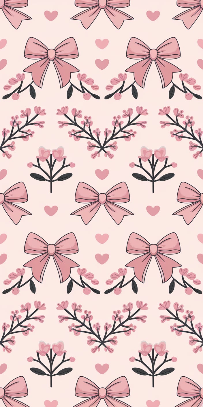 A cute pink bow and heart pattern set against a soft cream background. The symmetrical design and delicate floral details create a playful and charming vibe. This super cute wallpaper is perfect for iPhone and Samsung users who love girly and fun designs. Add a touch of sweetness to your phone with this adorable pattern.