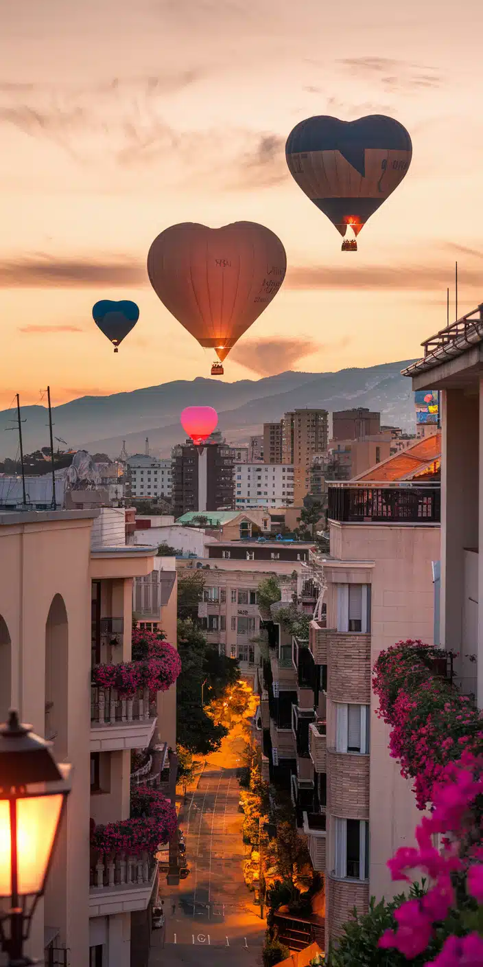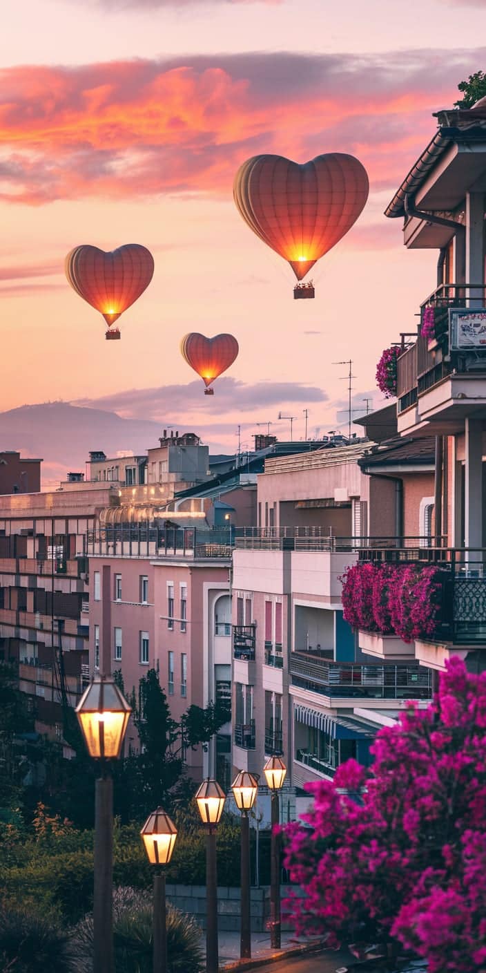 A dreamy cityscape at dusk with glowing heart-shaped hot air balloons drifting through the pastel sky. The warm lights from the street lamps and vibrant pink flowers on the balconies create a cozy and romantic atmosphere. This super cute wallpaper is perfect for iPhone and Samsung users who love city vibes with a touch of romance. Add a warm and loving feel to your phone with this heart-filled scene.