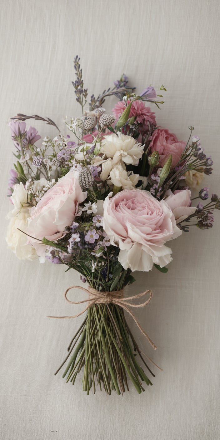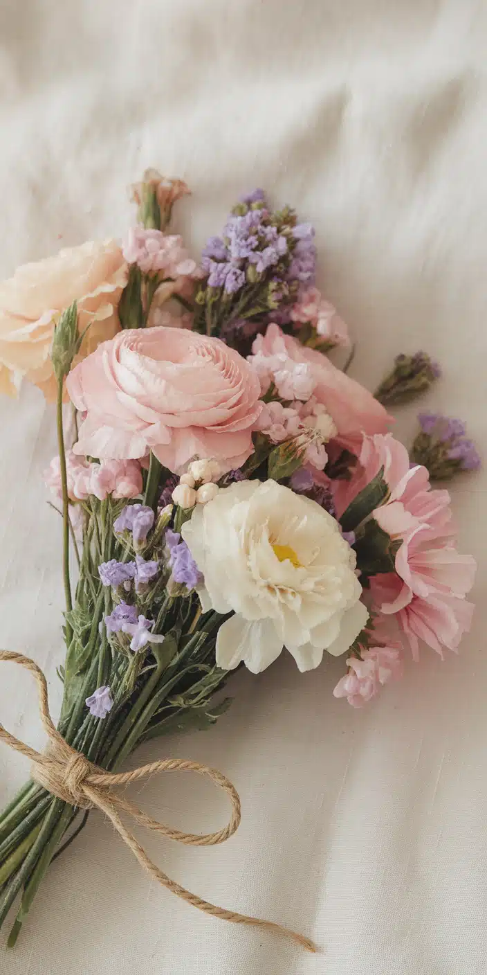 A delicate bouquet of soft pink, white, and lavender flowers tied with a rustic twine bow. The mix of pastel shades and natural textures creates a soft and romantic vibe. This cute home screen wallpaper is perfect for adding a floral touch to your iPhone or smartphone. Bring a calming and natural look to your screen with this beautiful floral design.