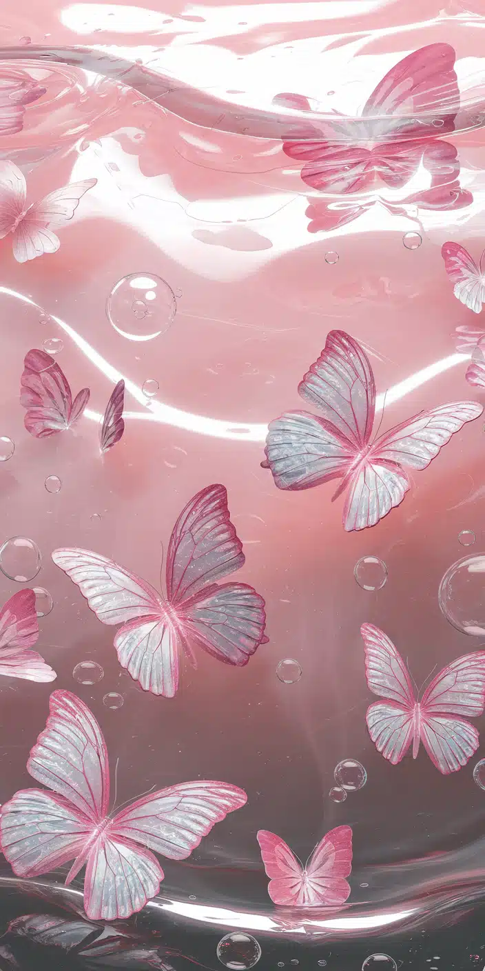 A stunning wallpaper featuring delicate pink butterflies floating within a glass-like surface. The soft pink tones and reflective bubbles create an elegant and modern feel. This super cute wallpaper is perfect for iPhone and Samsung users who love soft and artistic designs. Elevate your phone's style with this whimsical butterfly-inspired background.