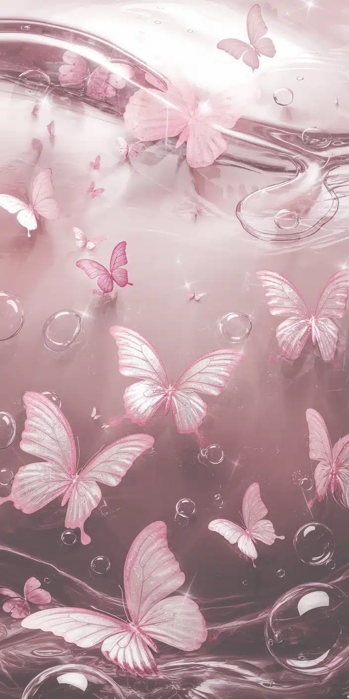An enchanting design featuring soft pink and white butterflies floating gracefully among transparent bubbles. The delicate pastel pink hues create a dreamy and magical atmosphere. This cute home screen wallpaper is perfect for iPhone and Samsung users who love soft, feminine designs. Bring a touch of magic and elegance to your phone with this beautiful butterfly-themed background.