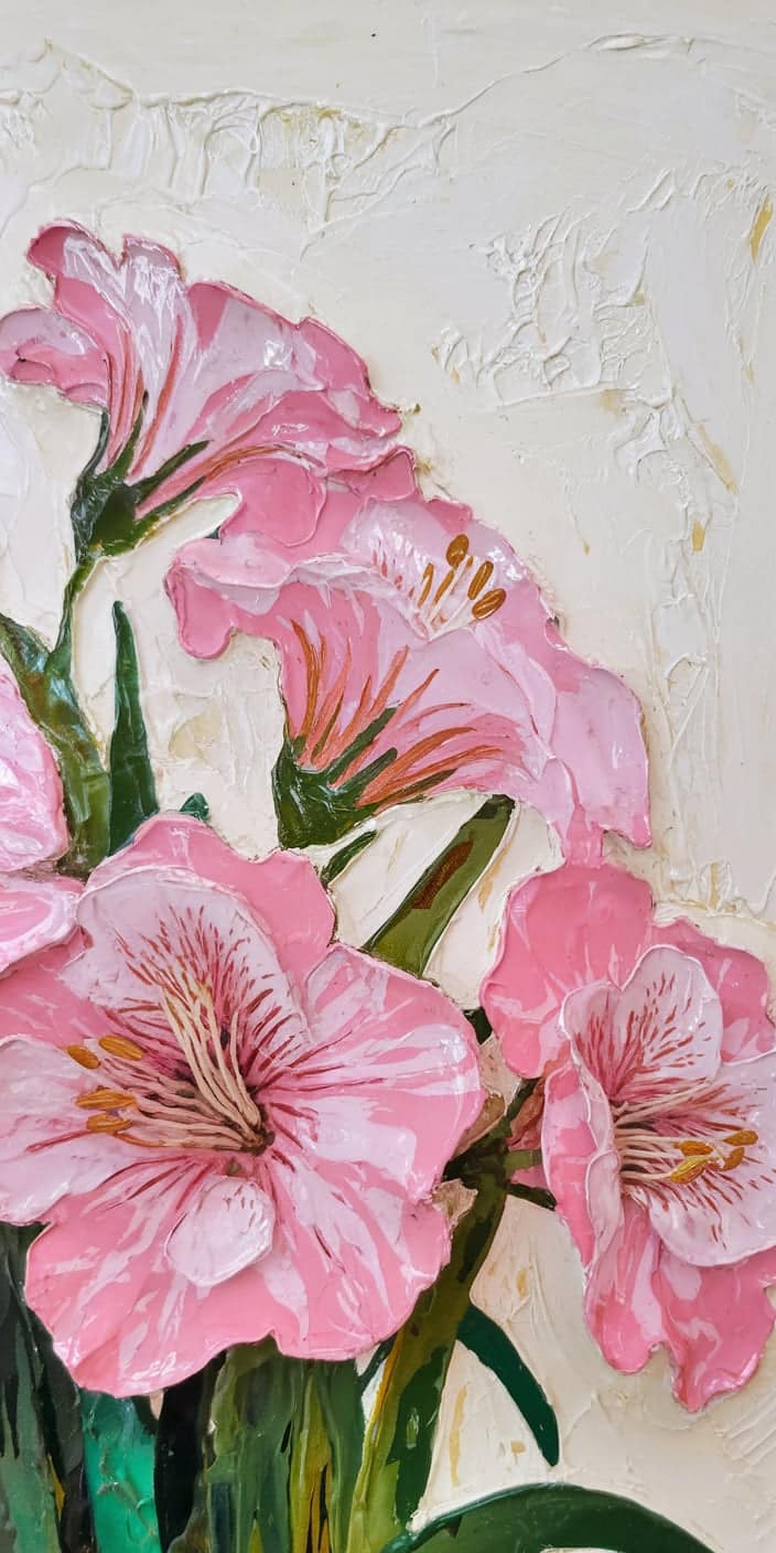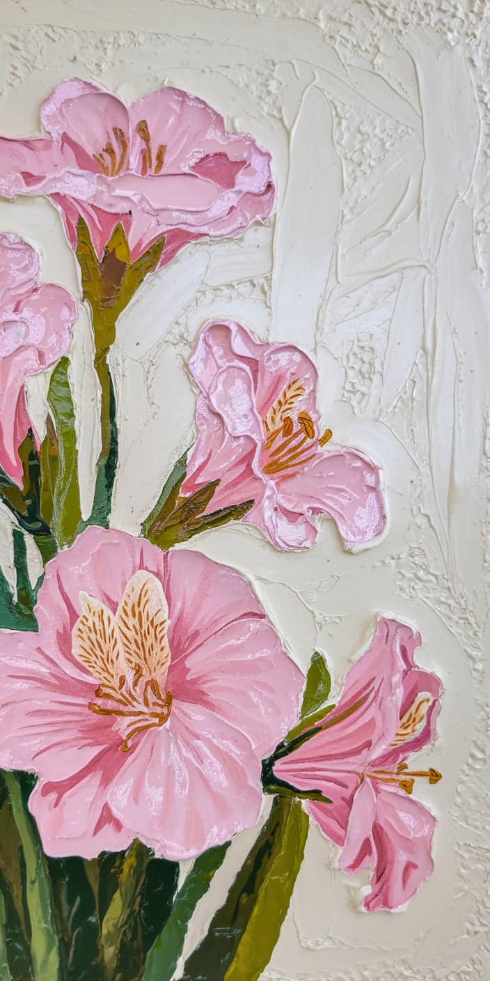 A delicate textured painting of pink flowers against a creamy white background. The detailed petals and rich green leaves create a soft and artistic vibe. This cute home screen wallpaper is ideal for iPhone and Samsung users who love floral and romantic designs. Bring a touch of elegance and softness to your phone with this stunning floral artwork.