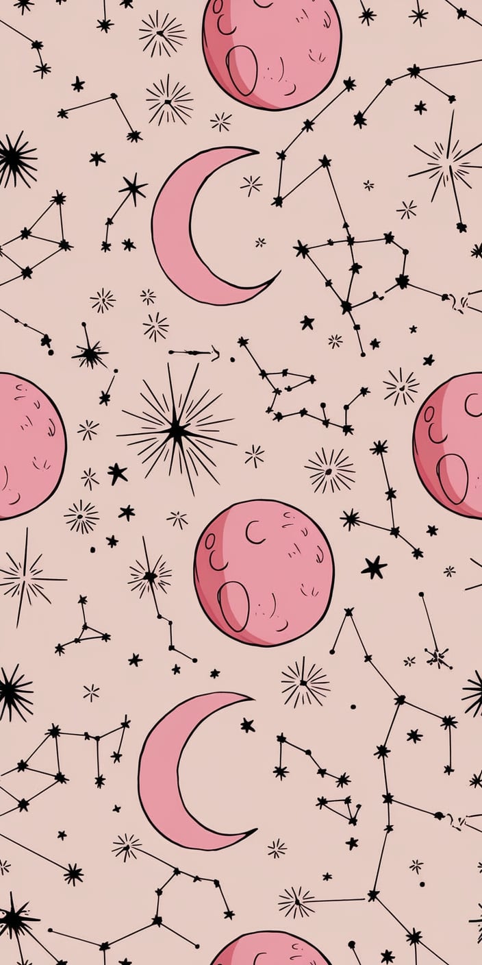 A charming pink moon and constellation design set against a soft beige background. The whimsical details of the crescent moons, stars, and cosmic patterns create a mystical vibe. This pink wallpaper background is perfect for adding a touch of celestial magic to your iPhone or smartphone screen. Ideal for anyone who loves dreamy and mystical aesthetics.