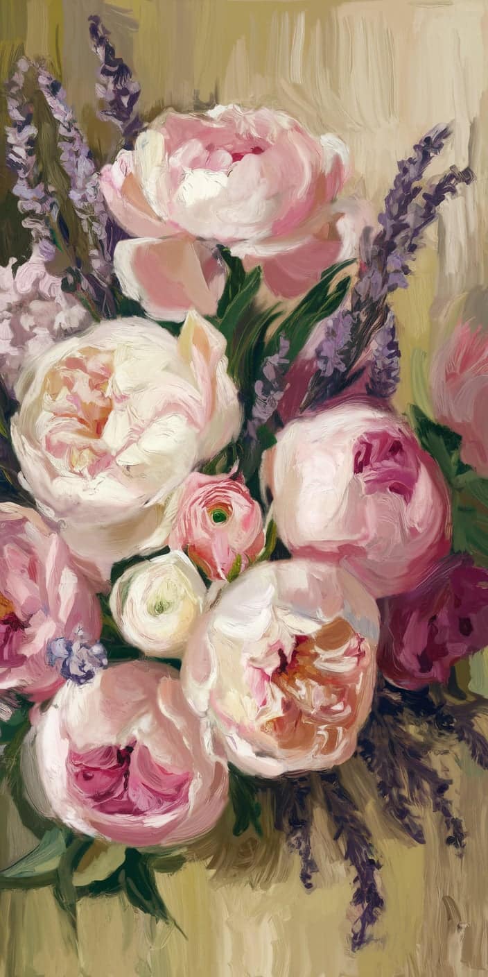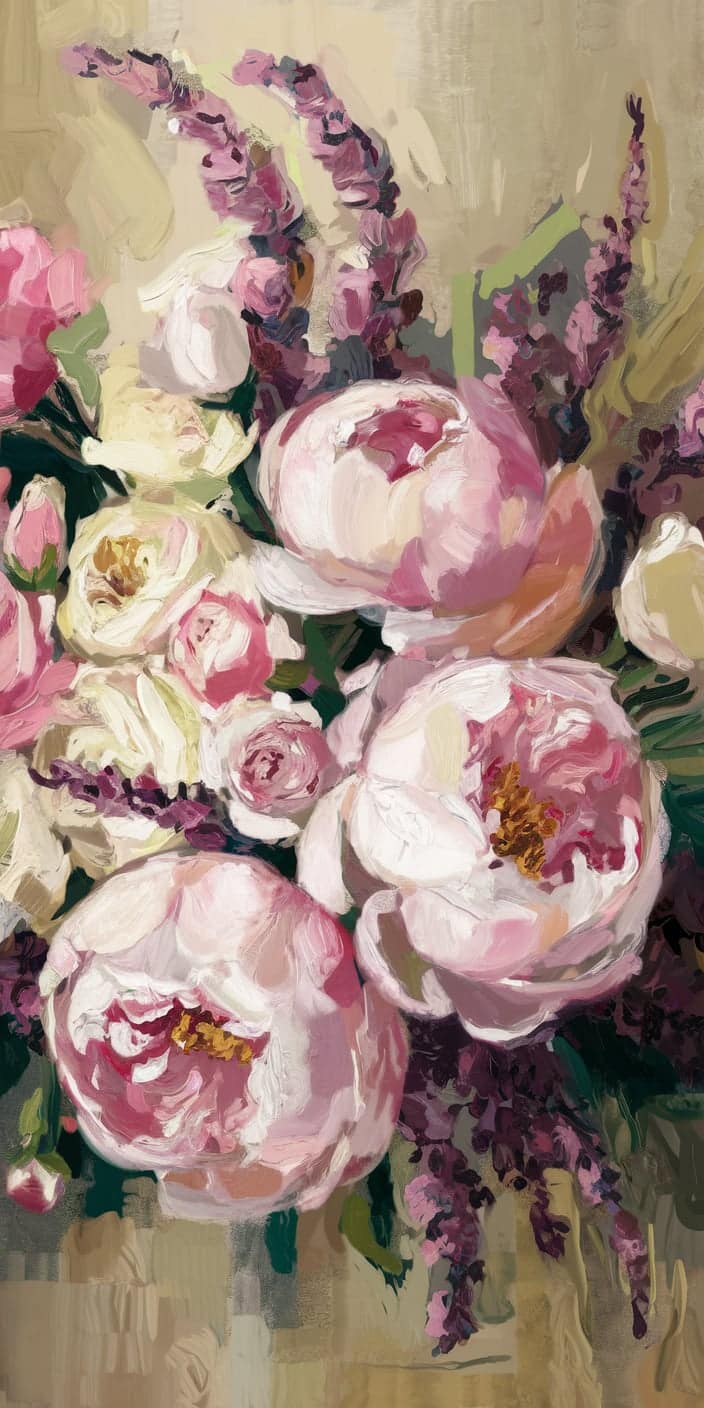 A stunning floral painting of soft pink peonies and lavender blooms set against an earthy background. The hand-painted texture and rich color tones create a romantic and artistic feel. This cute home screen wallpaper is perfect for iPhone and Samsung users who love floral and artistic designs. Bring a touch of art and elegance to your phone with this unique wallpaper.