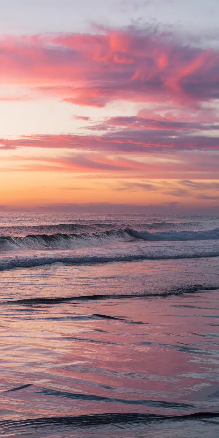 A stunning pink sunset over the ocean with soft pastel hues reflecting off gentle waves. The combination of pink, peach, and light blue tones creates a peaceful and calming vibe. This summer beach wallpaper is perfect for iPhone and Samsung users who love beach-inspired designs. Bring the beauty of a sunset to your phone with this dreamy wallpaper.