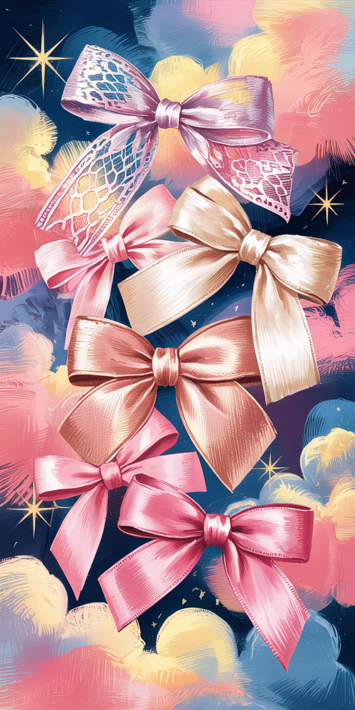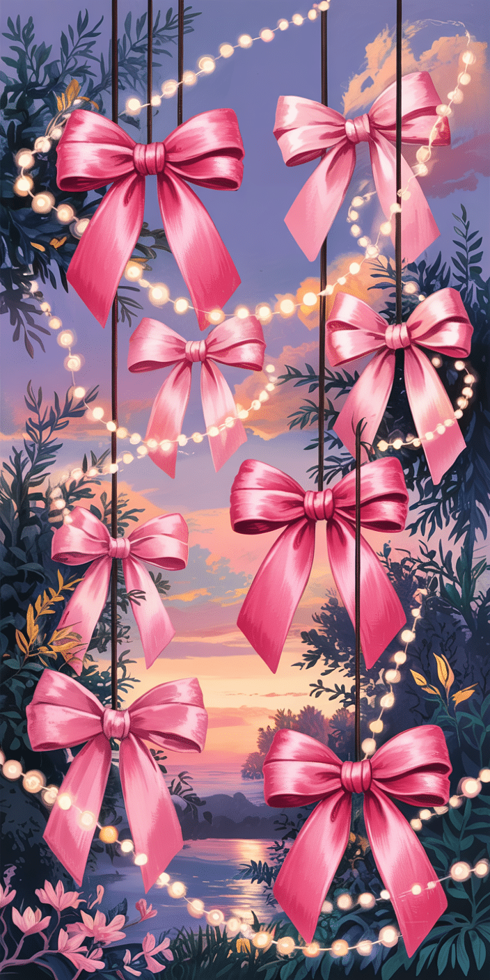 Seven shiny pink bows float against a glowing sunset and soft garlands of lights, bringing coquette dreams to life. This wallpaper is perfect for anyone who adores charming, girly vibes with a soft-glam twist. Whether you’re into Pink Wallpaper Iphone or magical twilight hues, this look is bound to brighten your phone. It’s elegance and sweetness wrapped in one pretty package.