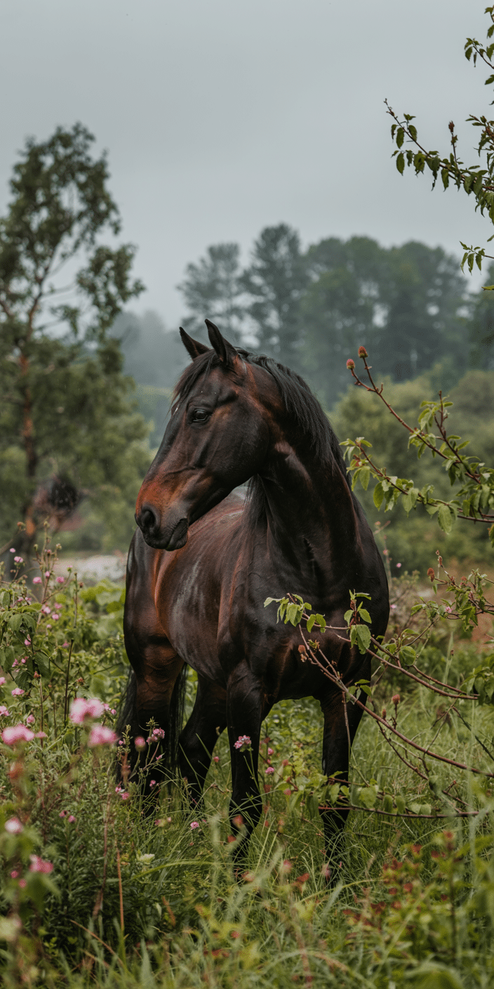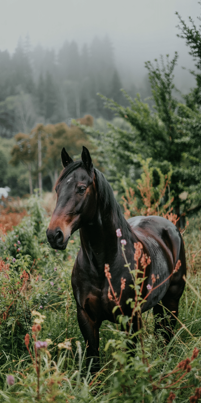 This dark horse among autumn blooms is all strength and serenity. Misty forest, deep earthy colors, and floral accents make this the perfect pick for moody nature lovers. Add wild beauty to your phone with this grounded Horse Wallpaper.