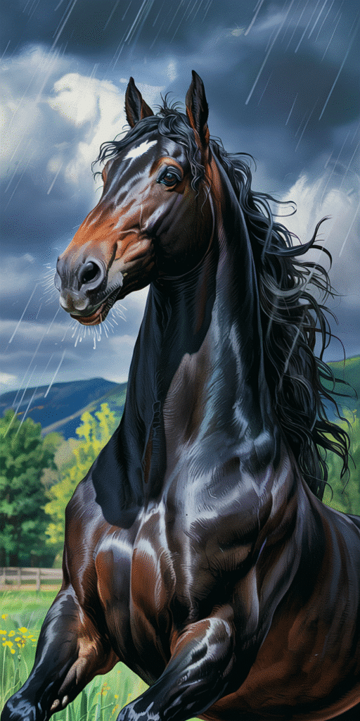 Feel the power of the storm in this intense portrait of a black horse standing tall beneath rainy skies. Its glossy coat and fierce gaze make this a go-to for lovers of bold equestrian art. Perfect for anyone into Horse Wall Art with serious mood. Let your screen show strength and soul.
