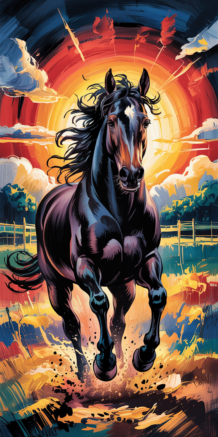 This bold, stylized wallpaper features a black horse galloping through a surreal sunset filled with brushstroke textures and dramatic lighting. The intense colors and powerful motion create an electrifying Horse Background for your phone. It’s a perfect fit if you’re drawn to expressive, energetic artwork that brings equestrian beauty to life. Let this majestic horse power up your home screen with color and motion.