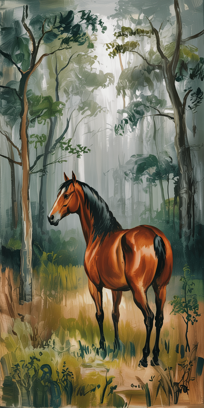 Let peaceful forest vibes meet equestrian grace with this hand-painted style wallpaper. The soft greens and earth tones create a calm, woodsy backdrop, perfect for lovers of Horse Wall Art and natural beauty. This strong yet gentle horse adds quiet strength to your screen. It’s a rustic retreat for your phone.