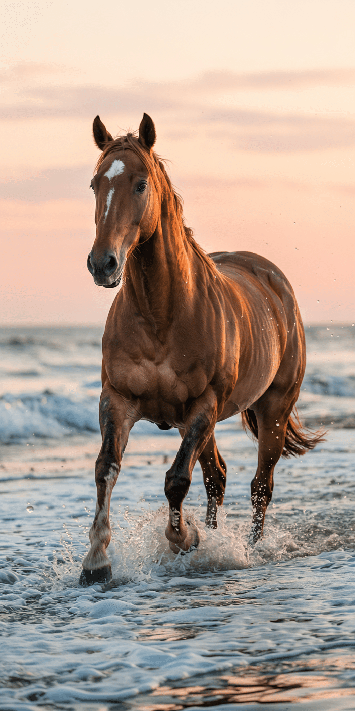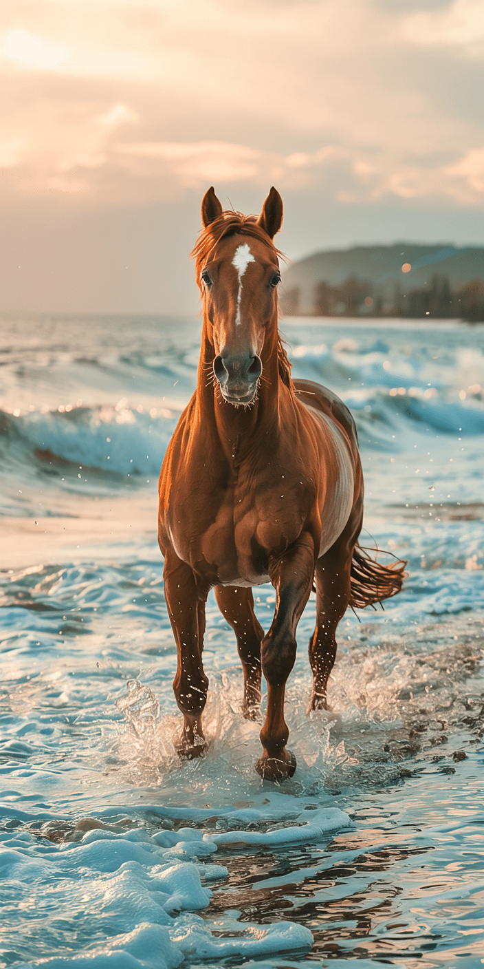 Feel the strength and freedom of this chestnut horse charging through the waves at sunset. The dreamy light and ocean backdrop create a perfect mix of power and peace. If you’re looking for something both bold and beautiful, this Horse Wallpaper will bring nature and spirit right to your home screen. It’s the beach day every equestrian dreams of.