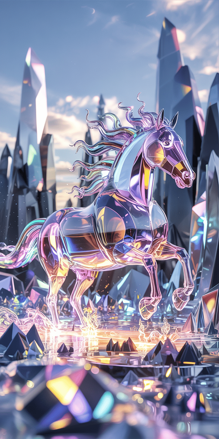 Step into a dreamy crystal world with this mesmerizing glass horse that glows with shimmering rainbow colors. It’s a stunning fusion of fantasy and elegance, perfect for those who love ethereal vibes and Horse Standing artwork. If you want your phone to shine as bright as your imagination, this wallpaper is it. Let your screen sparkle like never before!