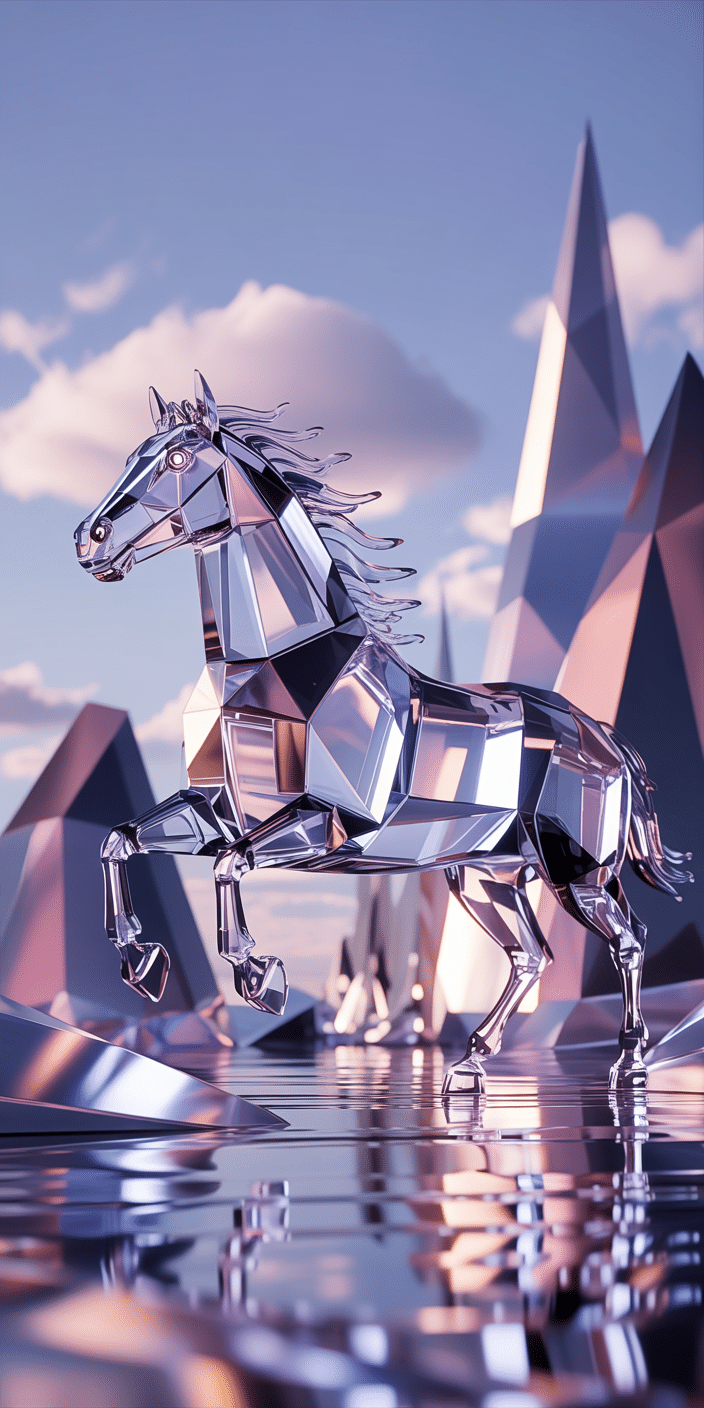 This sleek glass horse glows with modern magic in soft pinks and purples. Its geometric form makes it a standout for anyone into futuristic art or minimal elegance. It’s like a sculpture in motion—perfect for your phone screen. Let this modern take on Horse Wall Art bring some sparkle to your day.