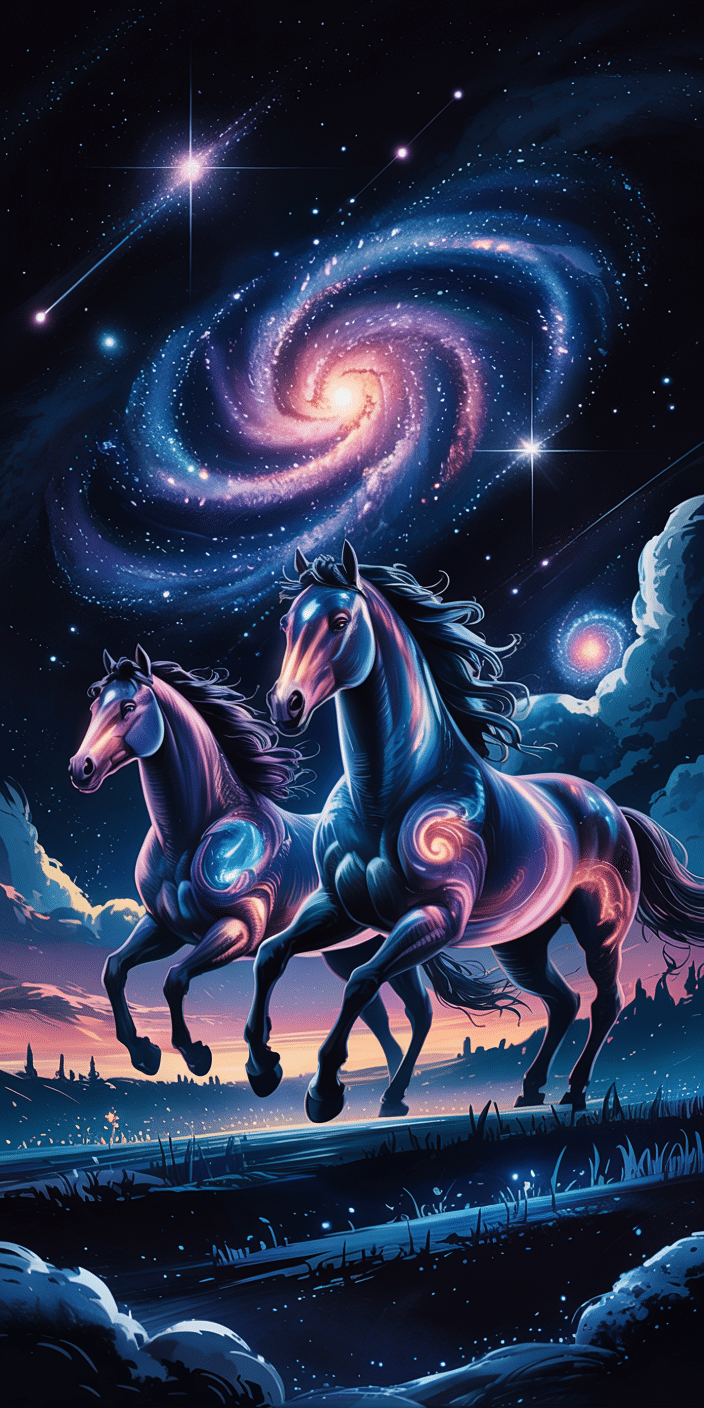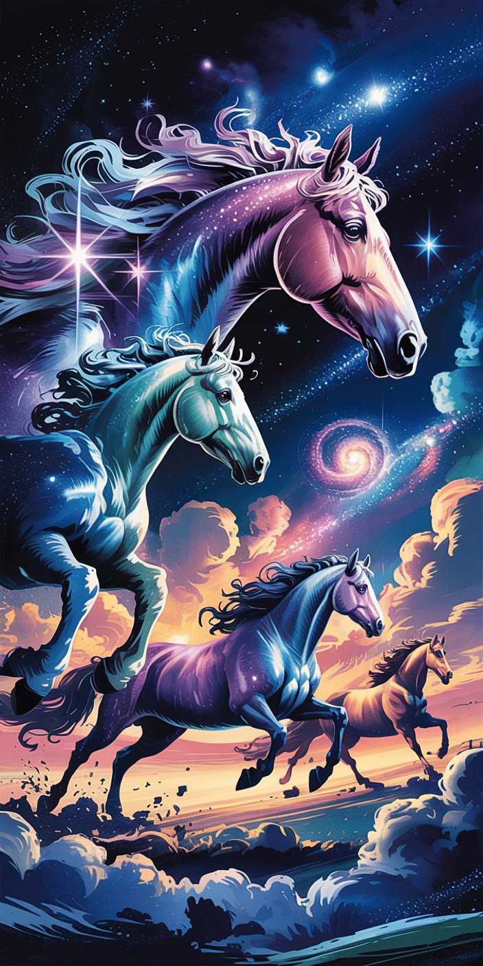 These radiant horses race across a dreamy galaxy-scape filled with glowing clouds and cosmic light. Their swirling coats shimmer with starlight, making this one of the most whimsical and ethereal wallpapers in the collection. If you love fantasy horses and heavenly skies, this one’s a perfect match. Let your phone screen glow with magic and movement.