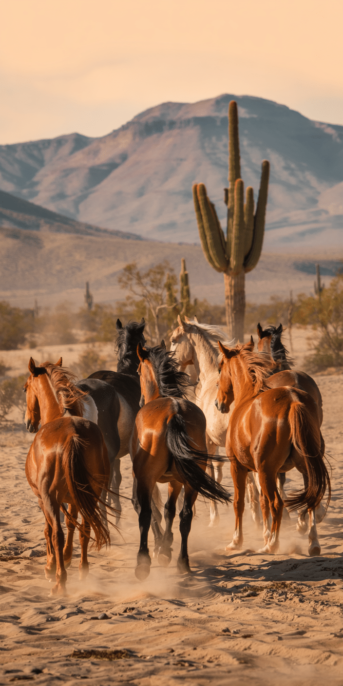 This western desert scene shows a herd of horses moving forward with dust and purpose. Surrounded by cacti and mountains, it’s got serious wild west energy. If you’re into Western Posters and Different Horse Breeds, this wallpaper brings the adventure right to your screen. Saddle up for some serious vibe.