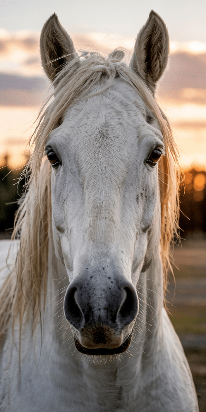 This bold close-up brings you eye to eye with the elegance of a white horse at sunset. The light, the focus, and the soft textures make it feel almost alive. Perfect for fans of Horse Standing shots and minimalist beauty. Let your screen reflect calm strength and natural grace.