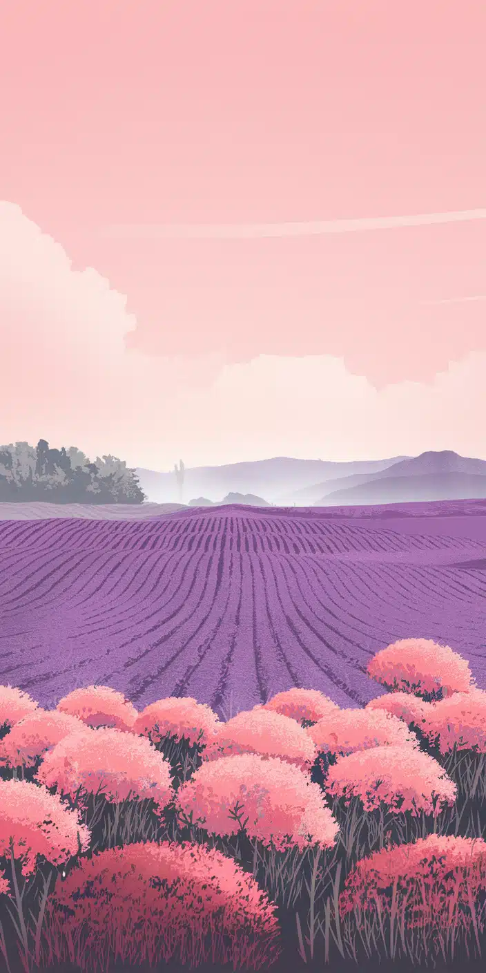 Capture the beauty of a lavender field at sunset with this soft pink and purple design. The delicate floral details and gentle sky create a peaceful, romantic vibe.