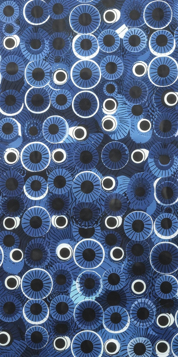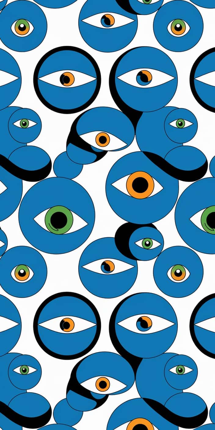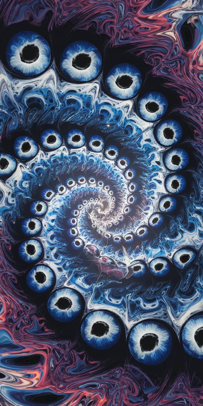 This swirling wallpaper features a mesmerizing pattern of blue eyes set against a blend of deep blues and purples. The intricate spiral design evokes a sense of mystery and spiritual protection. Perfect for those looking for a bold and captivating background.