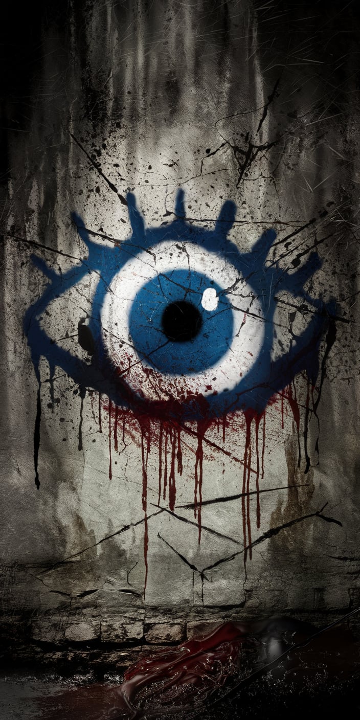 This edgy evil eye wallpaper features a striking blue eye painted on a weathered concrete wall, with dripping streaks of paint adding a rebellious vibe. The mix of blue and red tones gives it a bold and artistic touch. Ideal for those seeking a unique and expressive phone background.