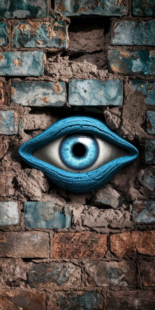 This striking blue evil eye wallpaper features a detailed eye embedded into a weathered brick wall. The vibrant blue tones contrast beautifully with the earthy shades of the wall, giving it a mystical and protective feel. Perfect for anyone looking to add a touch of spiritual symbolism to their phone.
