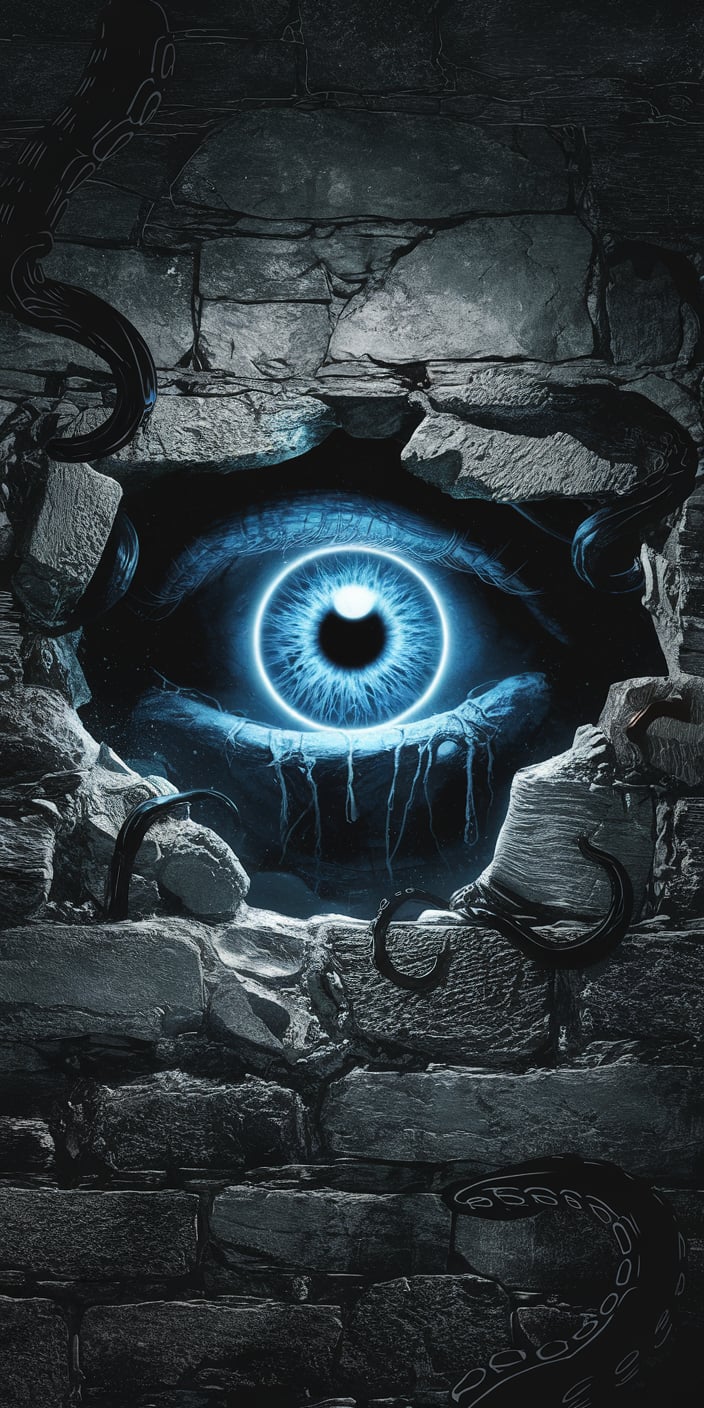 This otherworldly wallpaper features a glowing blue eye set in a cracked stone wall, surrounded by dark, twisting tentacles. The radiant blue eye contrasts sharply with the shadowy background, creating a mystical and captivating vibe. Perfect for adding a touch of cosmic mystery to your phone.