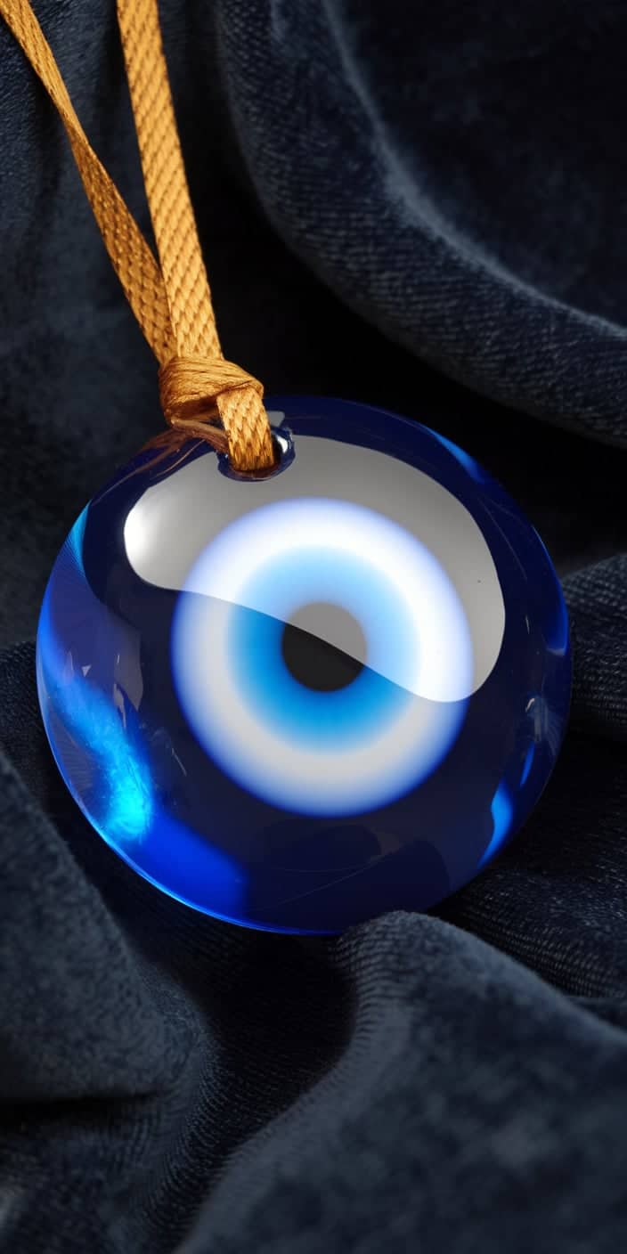 This stylish wallpaper features a detailed blue glass Evil Eye pendant hanging from a gold cord. The deep blue fabric background enhances the rich colors and reflective details, creating a chic and meaningful look.