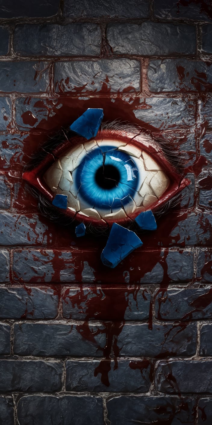 This dramatic wallpaper features a shattered blue evil eye set in a dark stone wall, with pieces of blue glass and red splashes creating a haunting yet captivating effect. The piercing blue eye contrasts sharply with the deep red, giving the image a bold and mystical vibe. Perfect for adding a touch of mystery and protection to your phone.