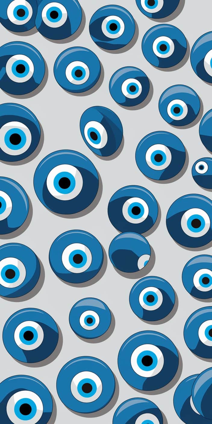 This playful wallpaper features a repeating pattern of blue Evil Eye beads in a hand-drawn cartoon style. The light gray background and bold blue tones create a fun and protective vibe. Perfect for adding a creative touch to your phone.
