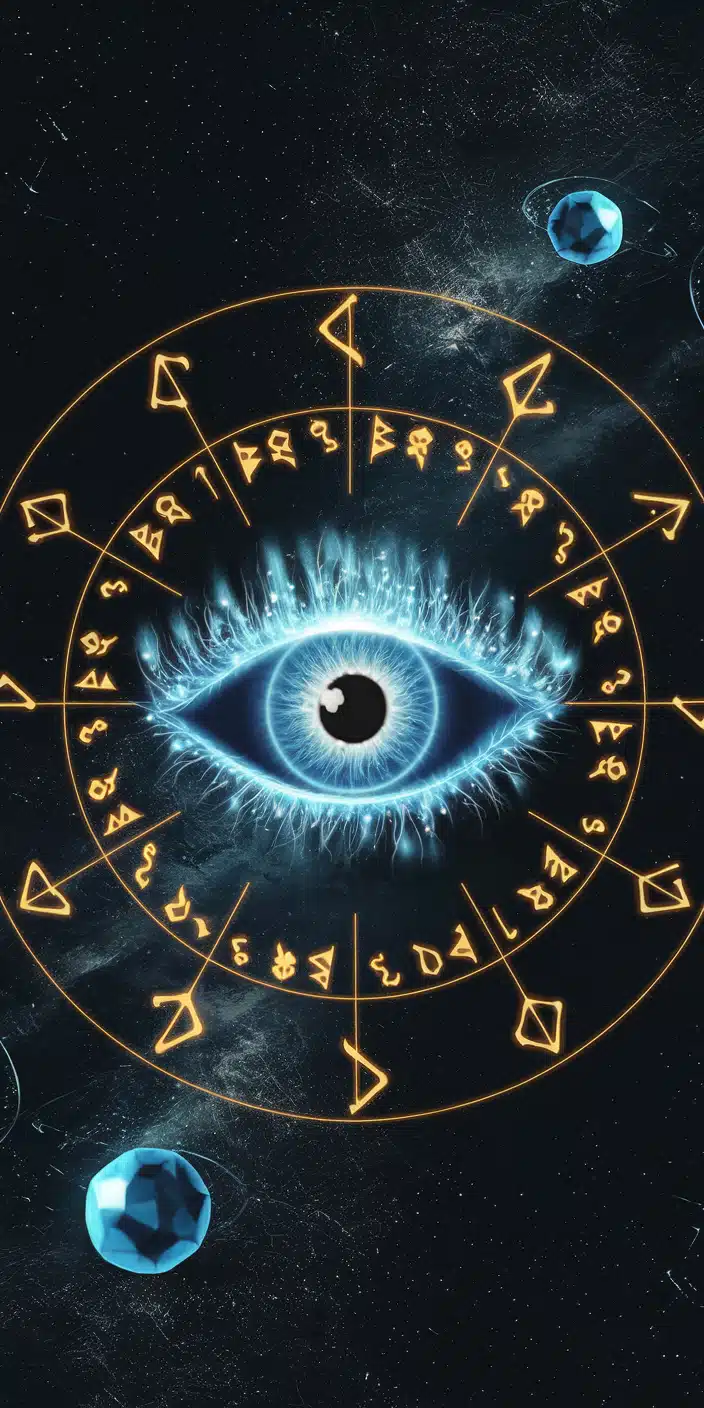 This cosmic wallpaper features a glowing blue eye surrounded by golden rune symbols and a deep starry background. The mix of mystical symbols and electric blue hues creates a powerful and enchanting effect. Perfect for those drawn to spiritual and magical aesthetics.