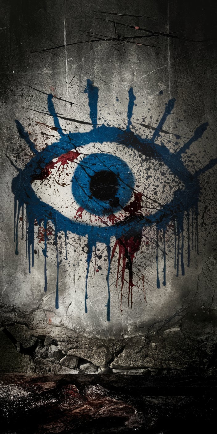 This dramatic wallpaper features a cracked blue evil eye embedded in a dark stone wall, surrounded by splashes of red paint. The deep blue tones of the eye contrast with the rough textures, creating a haunting yet protective look. Ideal for those seeking a mix of mystery and spiritual symbolism.
