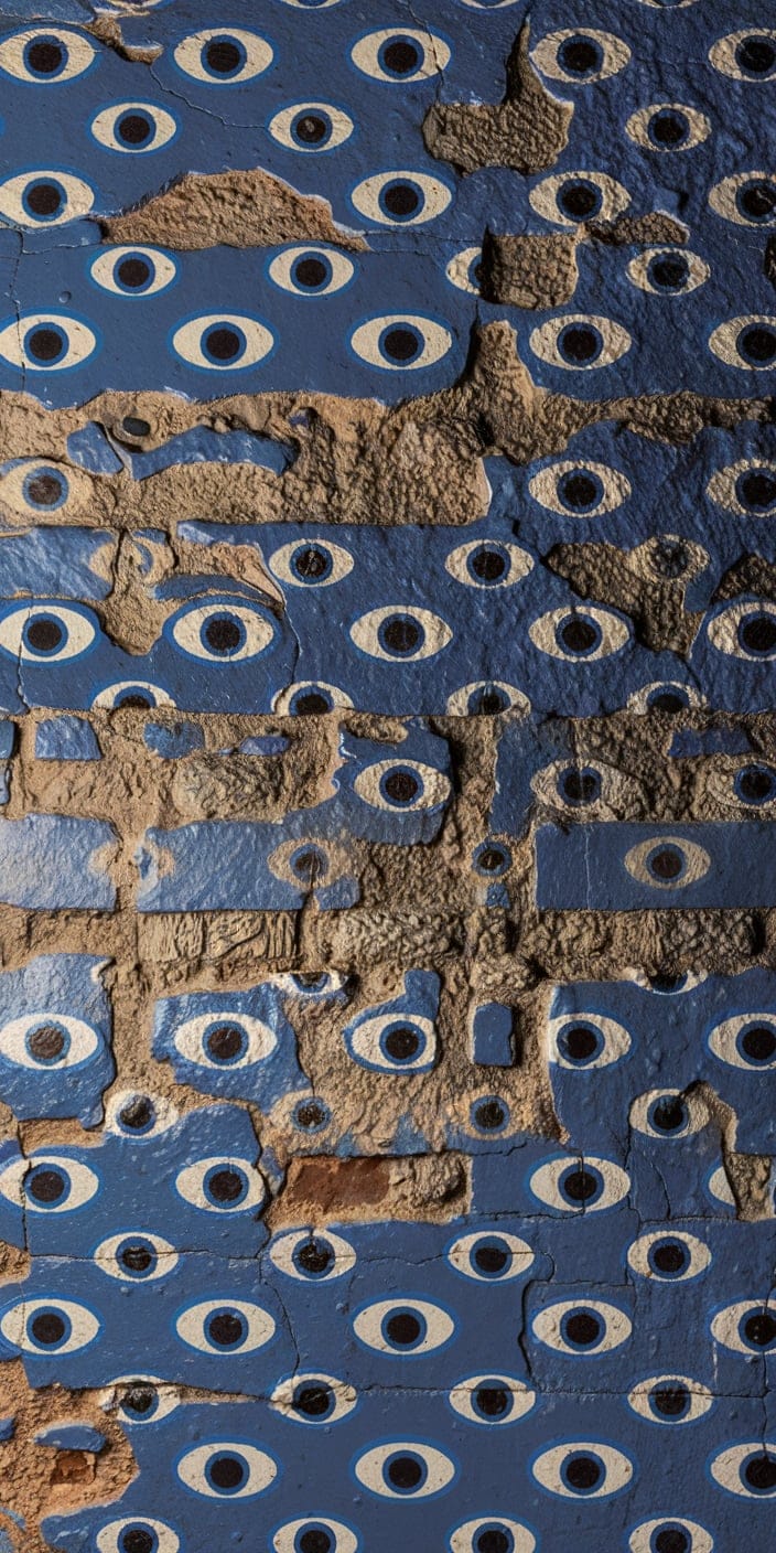 This unique wallpaper features a repeating pattern of blue and white evil eyes on a weathered stone wall. The vibrant blue tones contrast with the earthy textures, creating a harmonious blend of artistic detail and protective symbolism. Ideal for those who love eye-catching patterns and mystical vibes.
